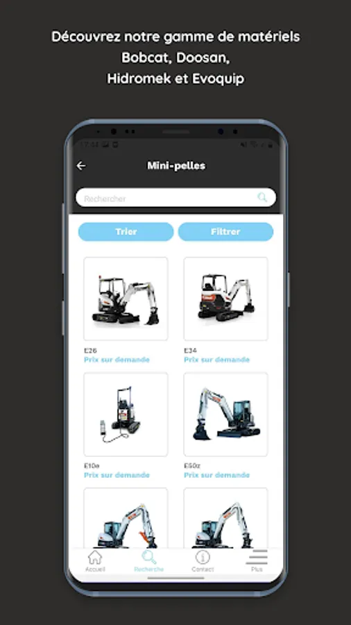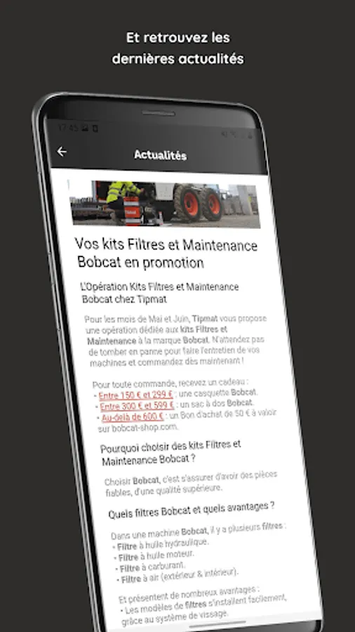 This new TIPMAT application is dedicated to construction and recycling professionals and thus offers all the information on our new or used machines: mini-loaders on tires or on tracks, mini-excavators, excavators on tires or on tracks, telescopic construction, agricultural or rotary, articulated loaders, backhoe loaders, dumpers, accessories, compacting equipment, crushers, screens, scrapers, conveyors... Subsidiary of the Dubreuil Group, Tipmat is a company that distributes the Bobcat, Doosan, Hidromek and Evoque brands and this, in the Great West and the Ile de France.