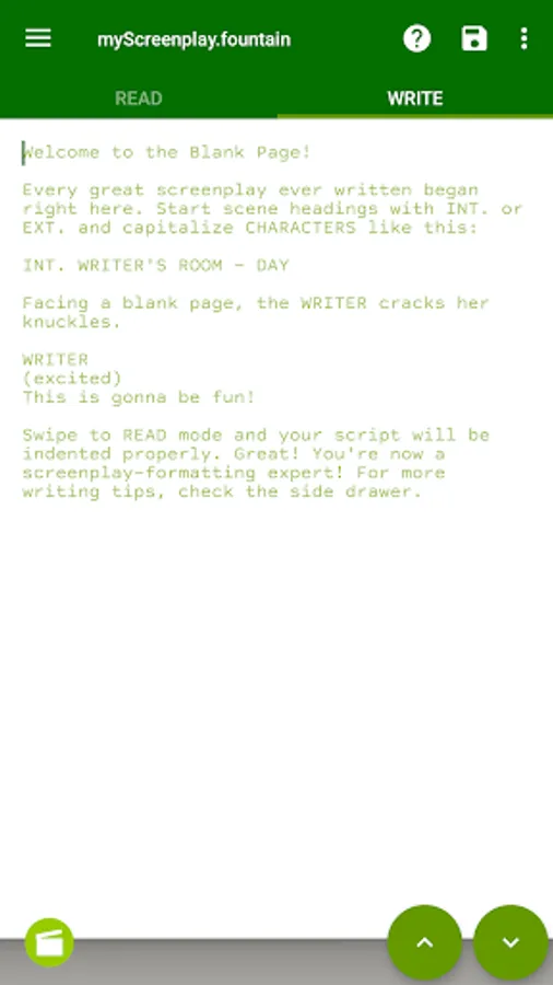 Create a new script and write naturally in the free-flowing plain-text editor -- without the "screenplay software formatting stuff" getting in your way. Don't break your writing flow to manually format or indent characters, slug lines, parentheticals, or action. Write uninterrupted-- scenes start with INT. or EXT, capitalize CHARACTER names, double-space between dialog.