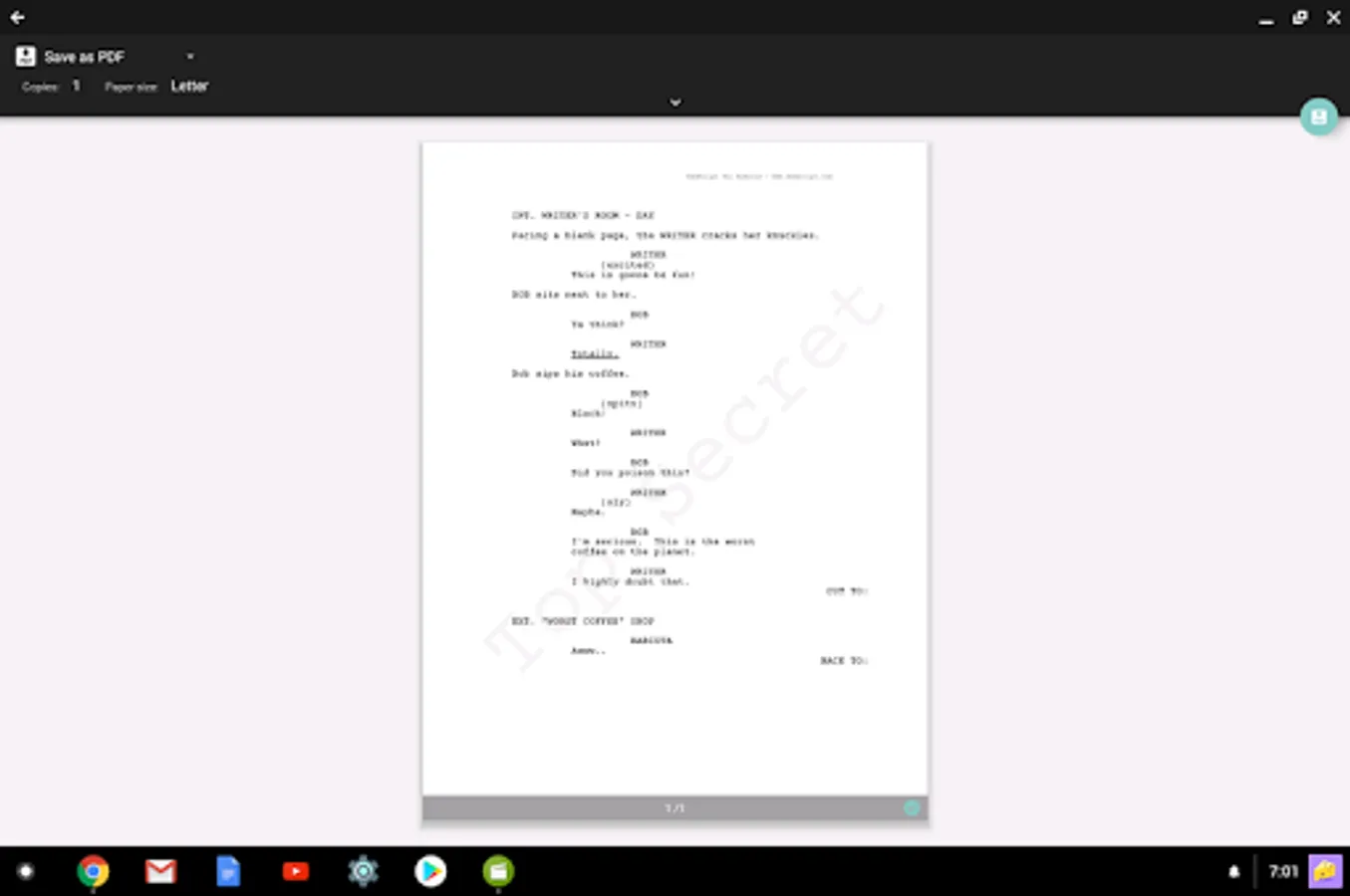 ✓ Read Final Draft (.FDX), Trelby, and Fountain. Output to PDF, .FDX, HTML, or printers