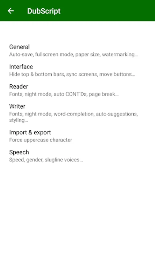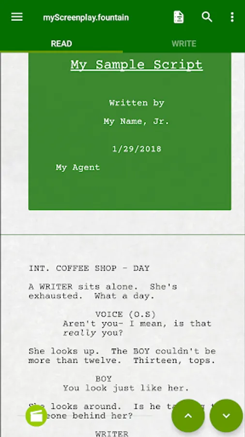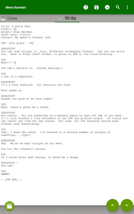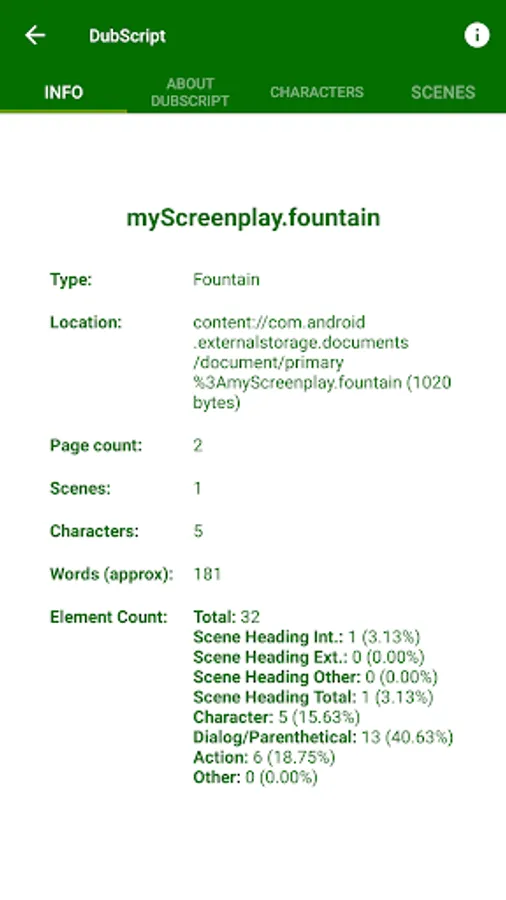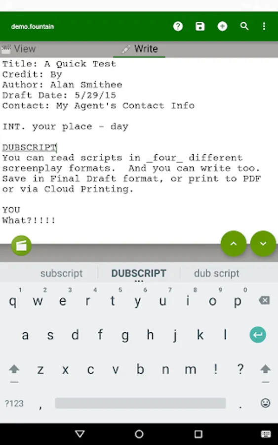 DubScript supports Fountain markup, a popular, open standard for writing scripts in plain-text. This means your screenplay file is fully-compatible with any old plain-text editor. To exchange with other apps, just copy and paste. Or hit the Share button to forward yourself (or your agent) a quick off-device backup via an email or messaging app.