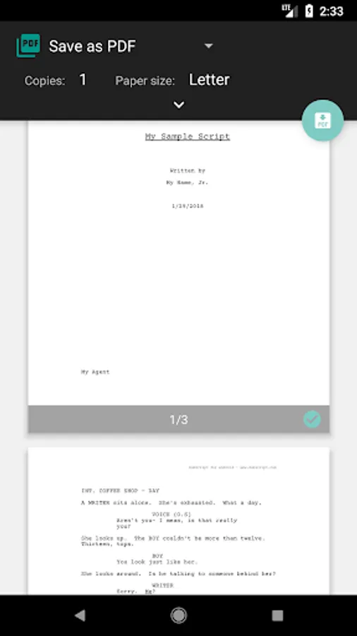 Now you have a proper screenplay. But before you output a PDF or export to .fdx, add a quick title page. It's just as easy to add scene numbers, side-by-side dialogue, centered text, notes, and page breaks.