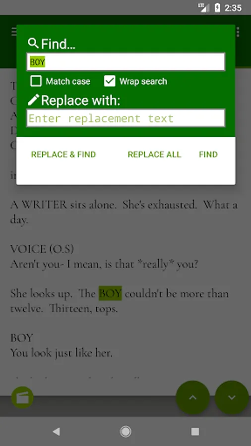 ✓ Character & slugline auto-suggestion, undo/redo, find/replace, copy/paste, spell-check, auto-complete, keyboard shortcuts, scene numbering, notes, and more