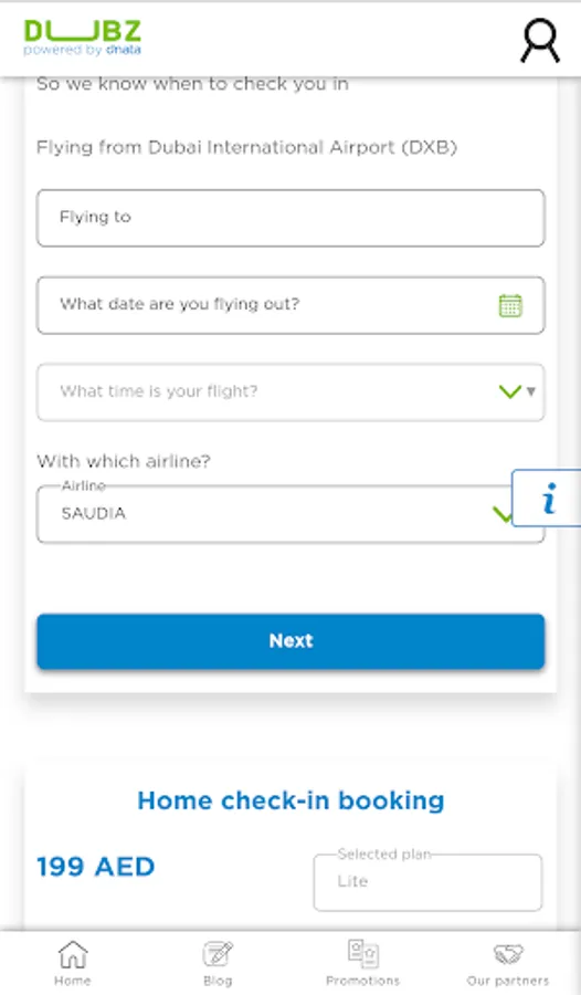 We provide a home check-in service where we will come to you anywhere in Dubai or Sharjah to check you into your flight and print your boarding pass. We will weigh, secure and tag your baggage, and then deliver them to the airport. This service is in cooperation with dnata and selected airlines.