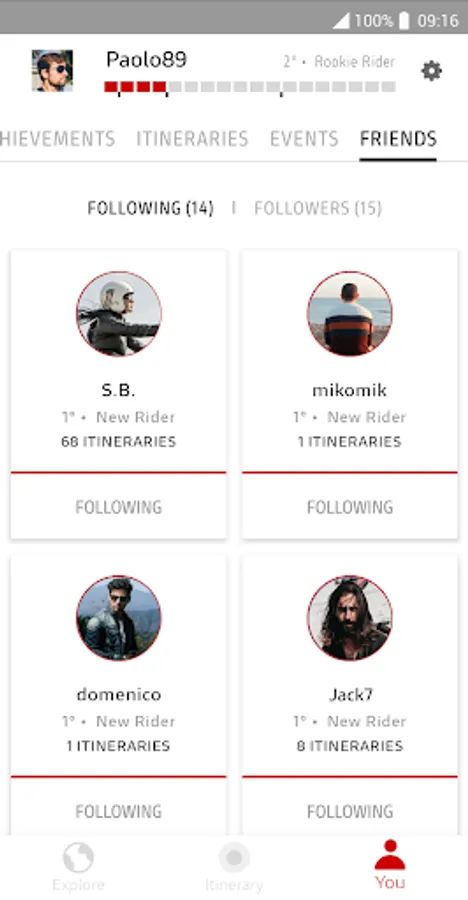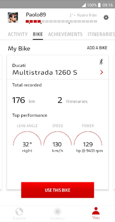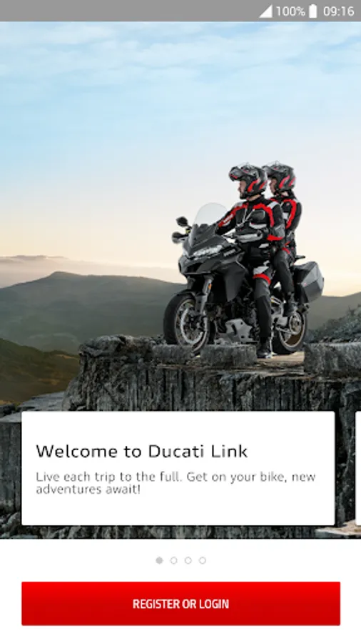 Access the App with your Ducati account or create your profile to stay connected with the Ducati digital world. Add your picture (a picture/photo of you) and your nickname and immediately connect your bike to start travelling (your journey).