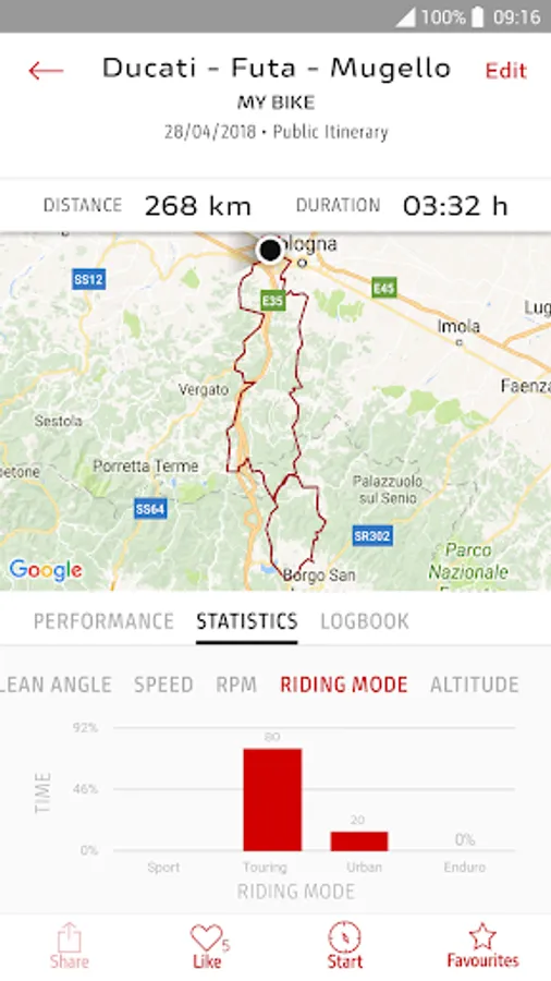 - Record your performance along the entire itinerary (route) (speed, bend angle, acceleration and other data mapped through the whole route, along with average maximum values and statistics)
