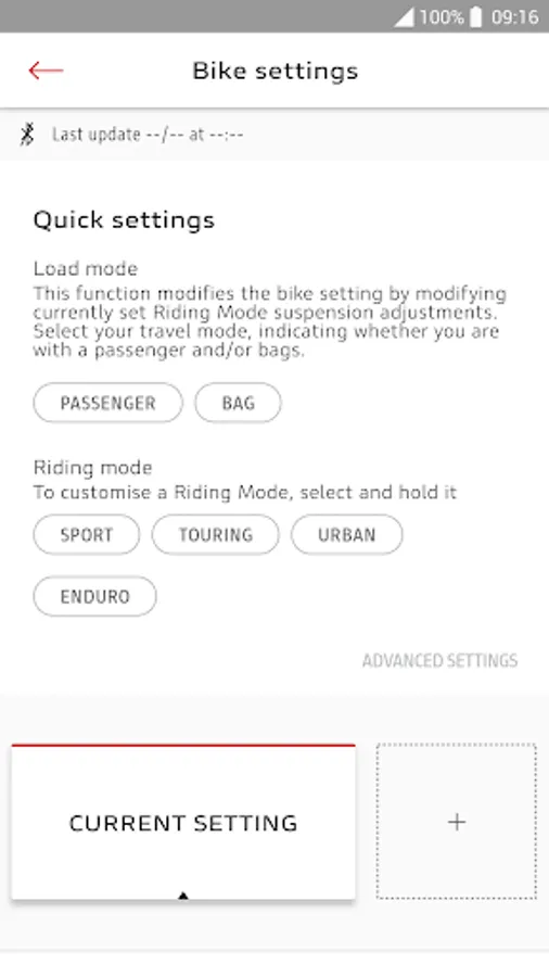 - Modify all the parameters of the bike (load mode, riding mode etc..) and save different driving scenarios