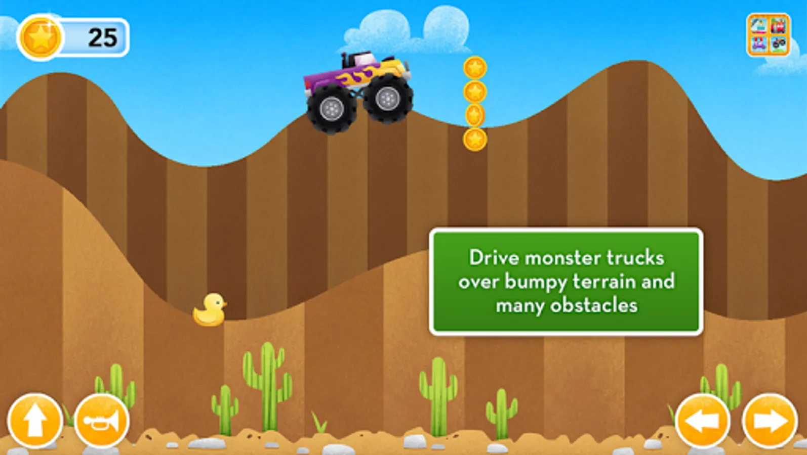 - MONSTER TRUCKS: Drive 10 different monster trucks through an ever-changing, bumpy