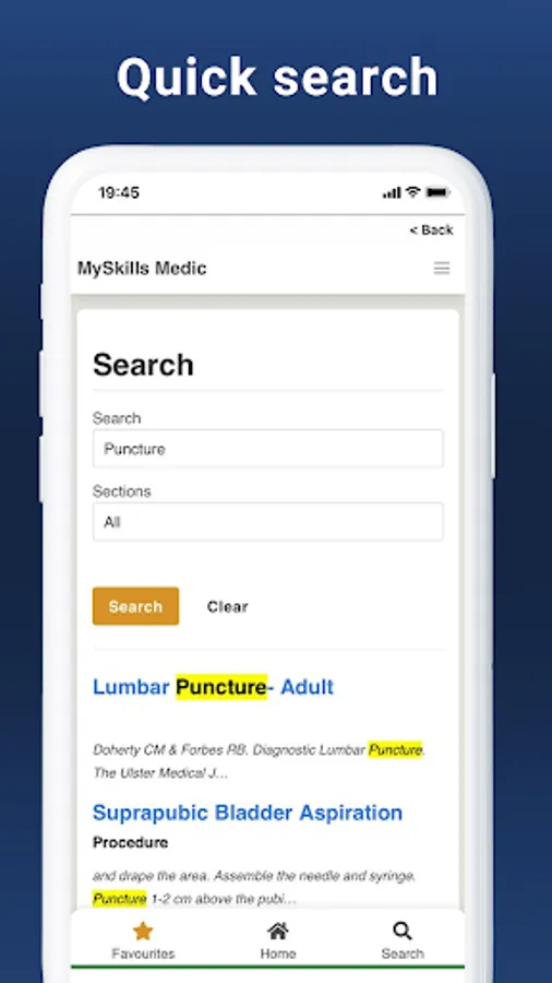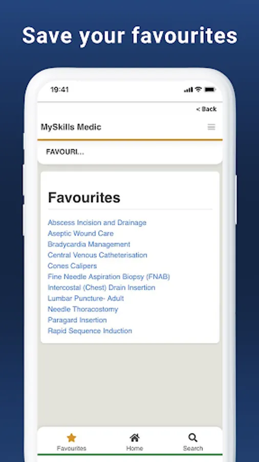 MySkills Medic app is free to download and can be used in the skills lab or at the patients’ bedside, even when internet connection is unavailable or unstable. The MySkills Medic menus, Search function, Favourites and pop-ups provide quick and easy navigation to the specific information you need, with additional links to related modules and internet resources. To ensure that the app does not use up valuable space on your mobile device, large files such as future videos will be accessible via external links.