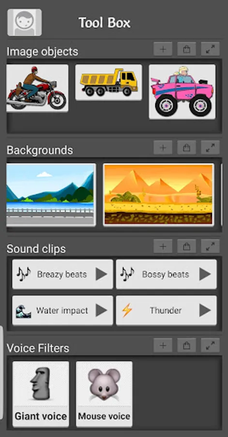 • The audio part also includes a complete audio recording tool set, that allows you to add your voice, background sounds, change your voice as you record it into your animation, so that you'll sound like a real cartoon character. You can also add sound effects FX and more to your animations.