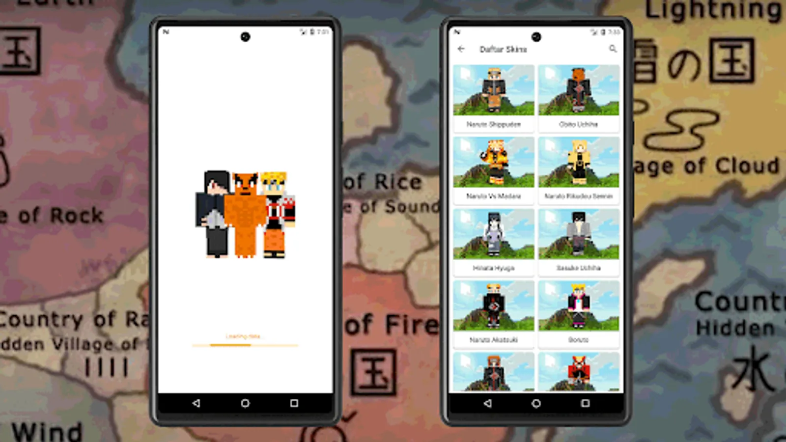 This application contains konoha ninja skins, sakura, sasuke, kakashi skins, Hinata, obito skins, orochimaru, say yamanaka, tobirama and many more.