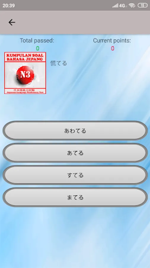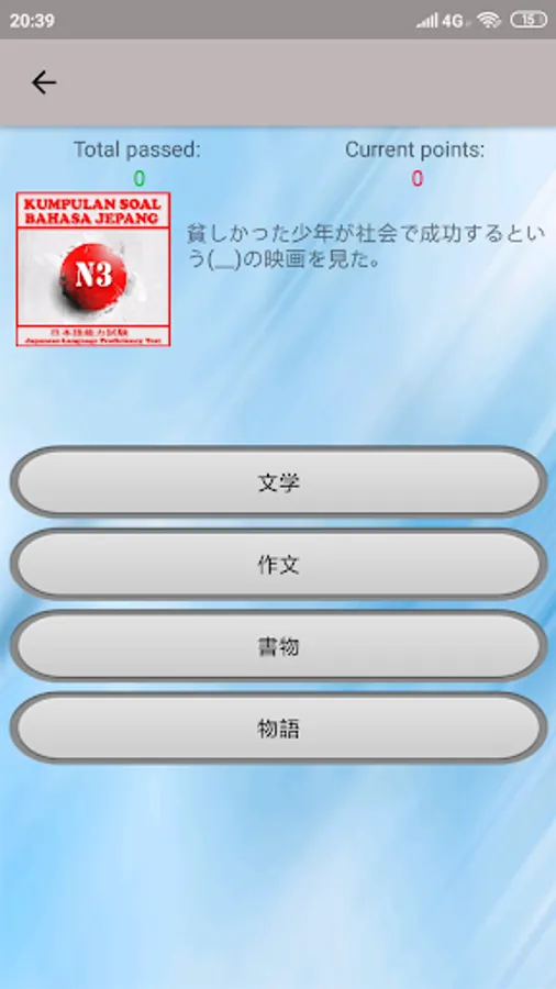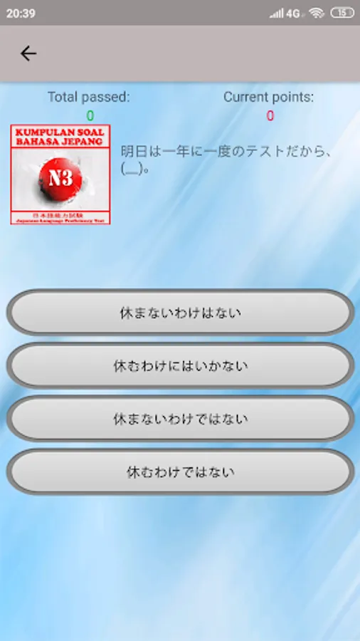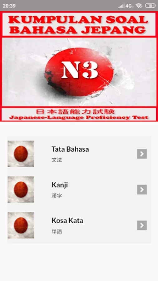 Aplikasi JLPT N3 - Tes Kemampuan Bahasa Jepang (日本語能力試験) ini dapat membantu Anda yang ingin menempuh Ujian Kemampuan Bahasa Jepang. Aplikasi ini berisi kumpulan soal dan jawaban JLPT untuk tingkat Menengah (N3).