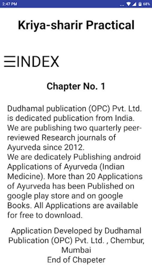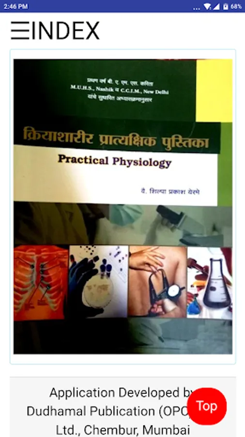 It gives me immense pleasure to present this Kriyasharir practical book Android application (which is developed by Dudhamal Publication (OPC) Pvt. Ltd., Chembur, Mumbai). This book is completely based on M.U.H.S. Nashik syllabus.