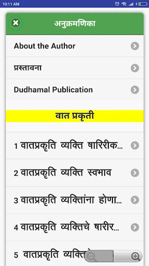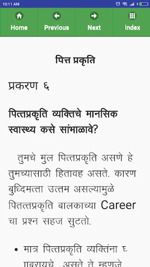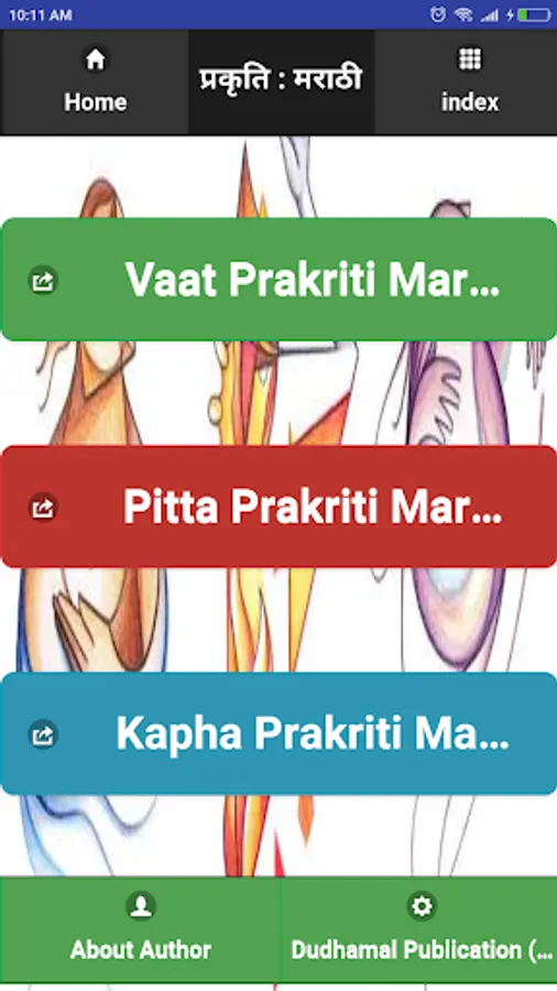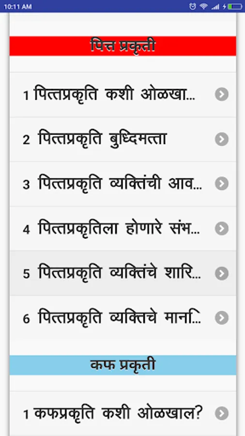 In this Ayurvedic Prakriti Concept App, We have developed all Three types i. e. VAATA, PITTA and KAPHA Prakriti details in the Marathi language in a single app.