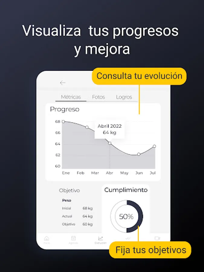 Register your metrics, your photos and the loads used in each training to keep track of your evolution and your progress.