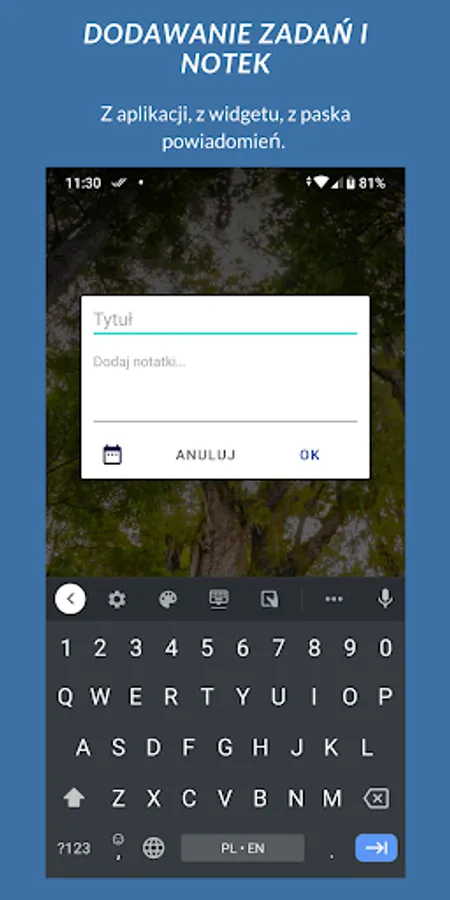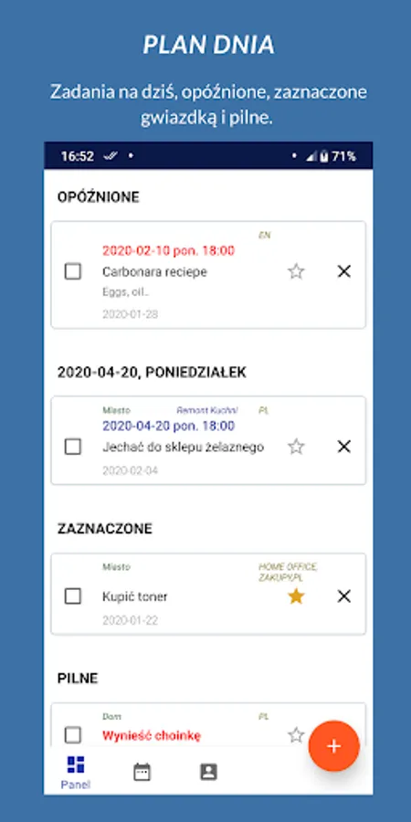 To add new tasks and notes press red '+' on the screen, or use a widget or applet from notification bar.