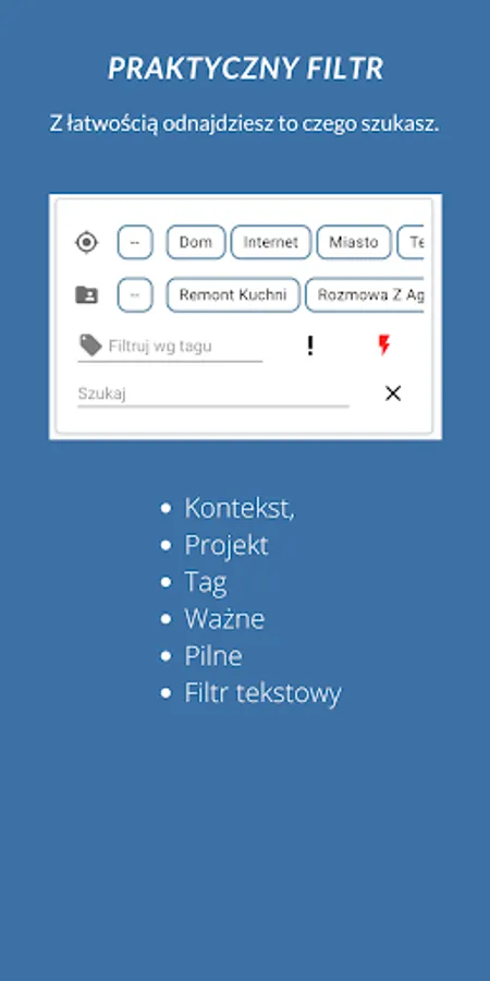 You can filter the tasks and notes by context, project, tag and importance and urgency. For example when you turn on your computer, you can filter all the tasks by context filter "Computer". Additionally you can narrow the result by filtering it by current project and/or tag.