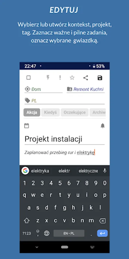 GTD Simple is as close to GTD methodology as possible. Each new case goes to INBOX, which is always easy accessible. Process each case from INBOX, assign correct context, project or tag. You can mark if the case is important or urgent. You can also set the due date and reminder.
