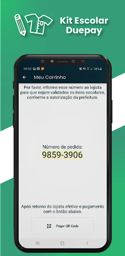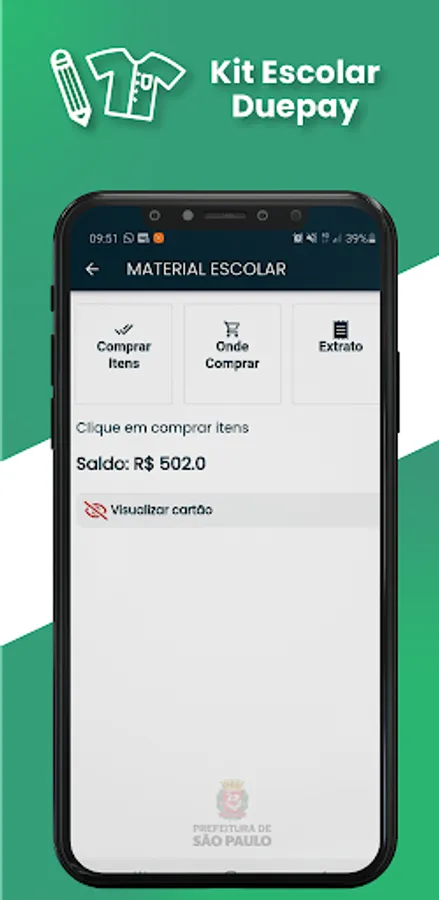 The DuePay School Kit application is used to purchase school materials or uniforms for the Municipal Education Network. Purchases are made using the mobile phone (QRCODE) and payment with cash is not required. Control of balance and purchase statement is performed directly in the app.