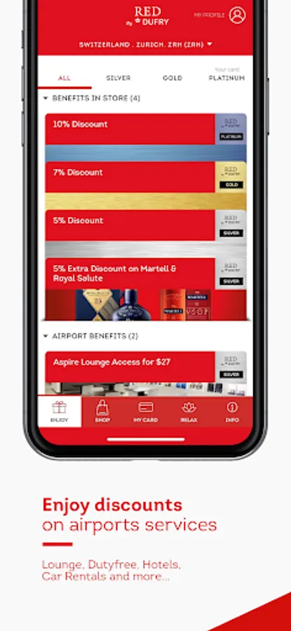 Get amazing benefits at airports when you travel. Download the Red By Dufry app and enjoy exclusive discounts in duty free stores in over 50 countries, free music streaming, access to VIP lounges and much more. You can also shop in our Reserve and Collect stores all over the world directly from your app.