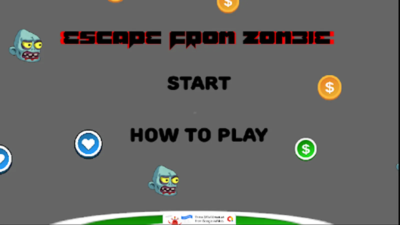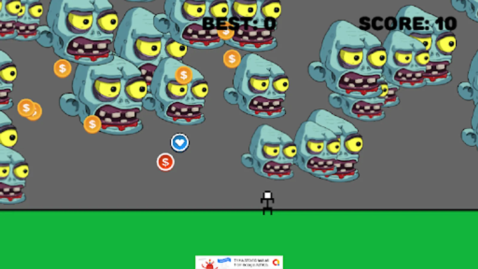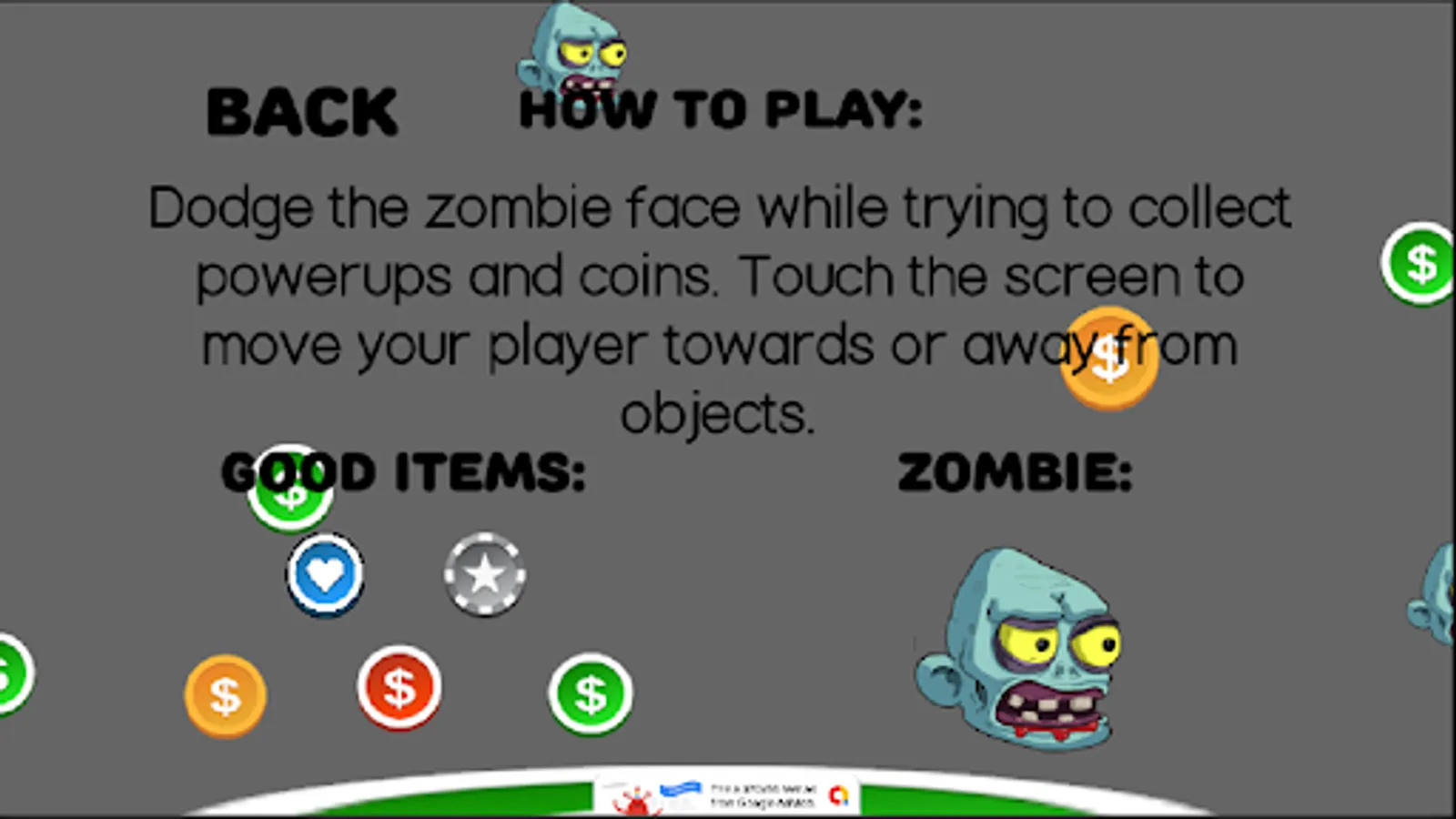 Dodge the zombie face while trying to collect powerups and coins. Touch the screen to move your player towards or away from objects.