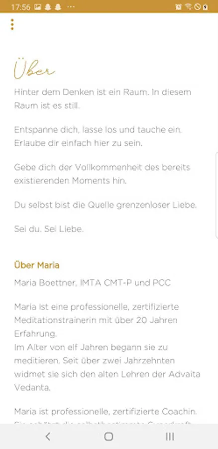 Maria`s beruhigende Stimme und über 25+ Jahre lange Erfahrung als zertifizierte und akkreditierte Meditationsexpertin spiegelt sich in jeder einzelnen Mediation wieder.