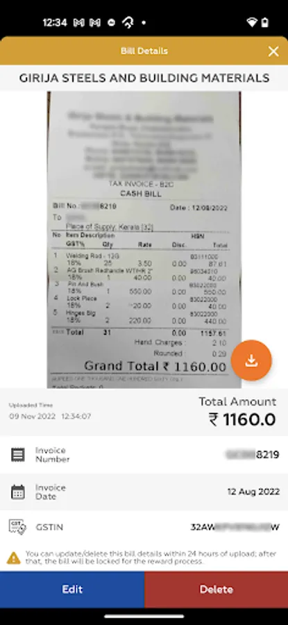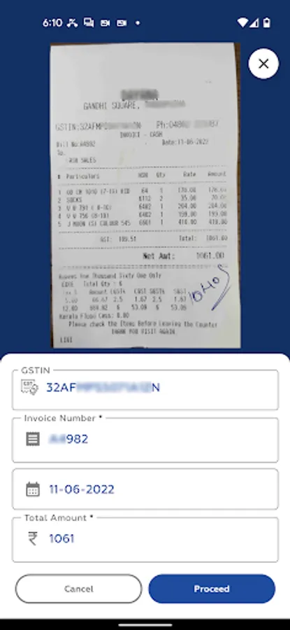 3. Optical Character Recognition (based on Machine learning and computer vision technologies) feature will automatically capture the GSTIN, Invoice No., Date, and Total Amount of Invoice/Bill uploaded. You can edit/confirm the details (while showing it on the preview screen) of Bill/Invoice data, if required, before uploading it to the GST Server.