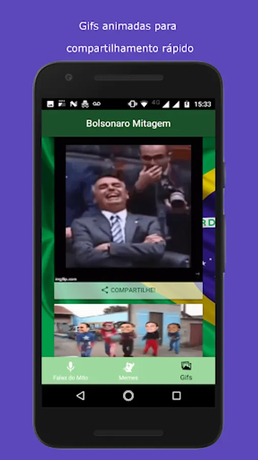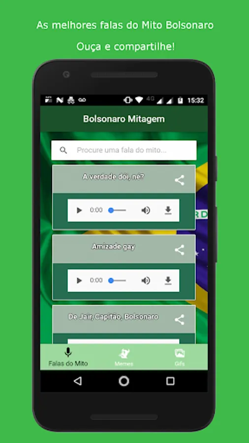 The BrazilianTrump (Bolsonaro Mitagem) application contains the most celebrated Bolsonaro presidential achievements. Get the best known quotes, memes, and animated gifs from Myth and share them with your friends.
