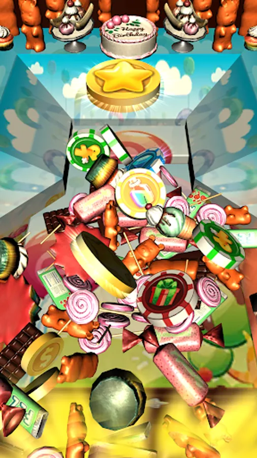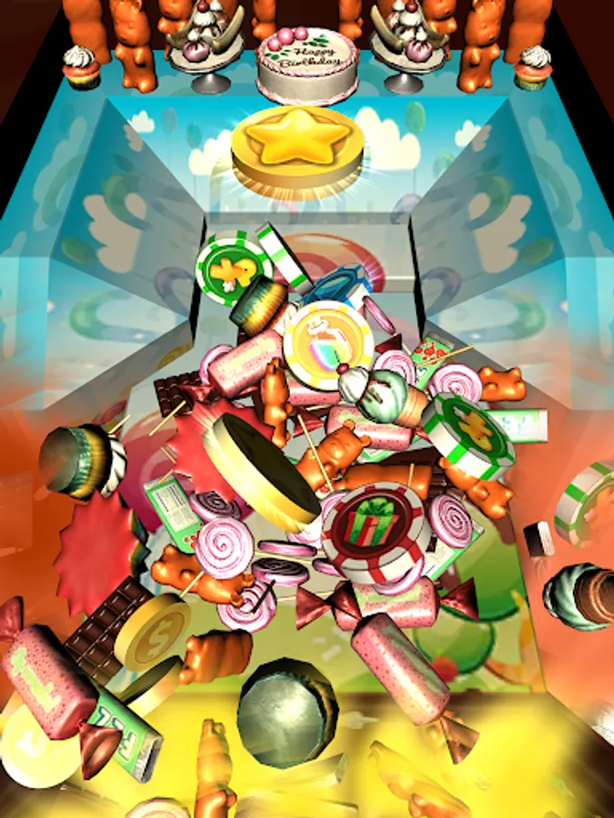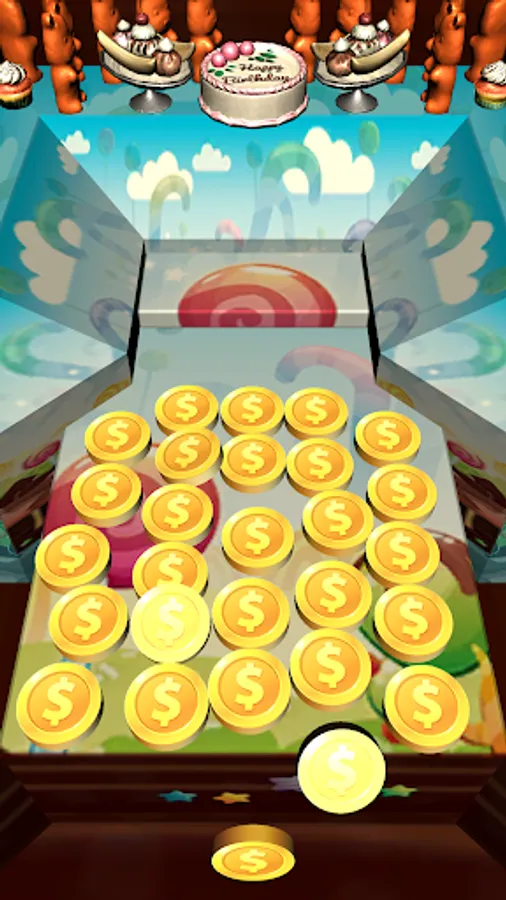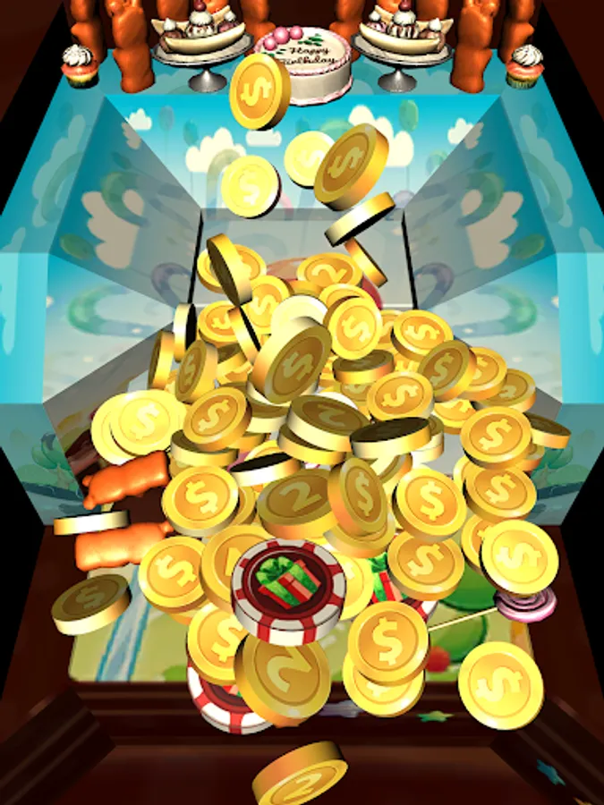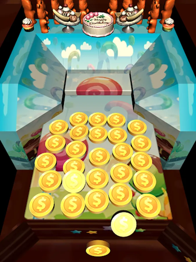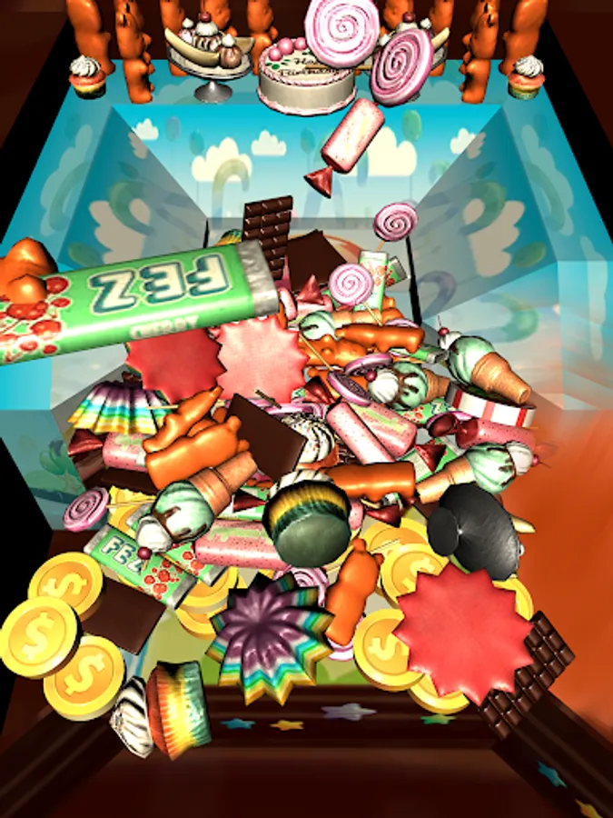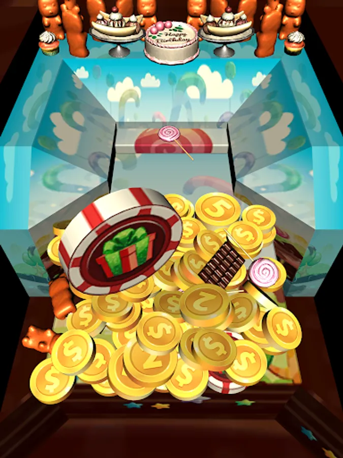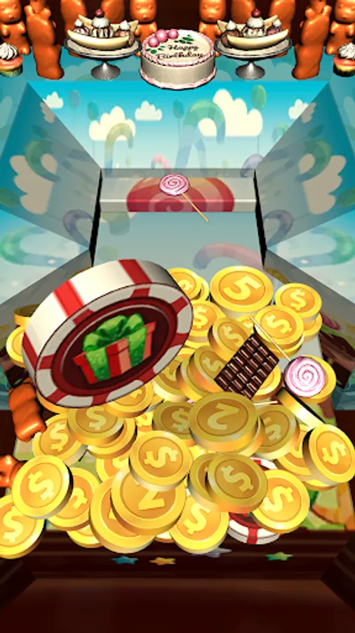 A LOT OF COINS & Candies in Candy Coins Dozer! Drop coins onto the pusher and move them all to the front of table to collect coins. More coins you collect - more chance to win special Chips & Prizes. And move coins careful not to push over the sides!