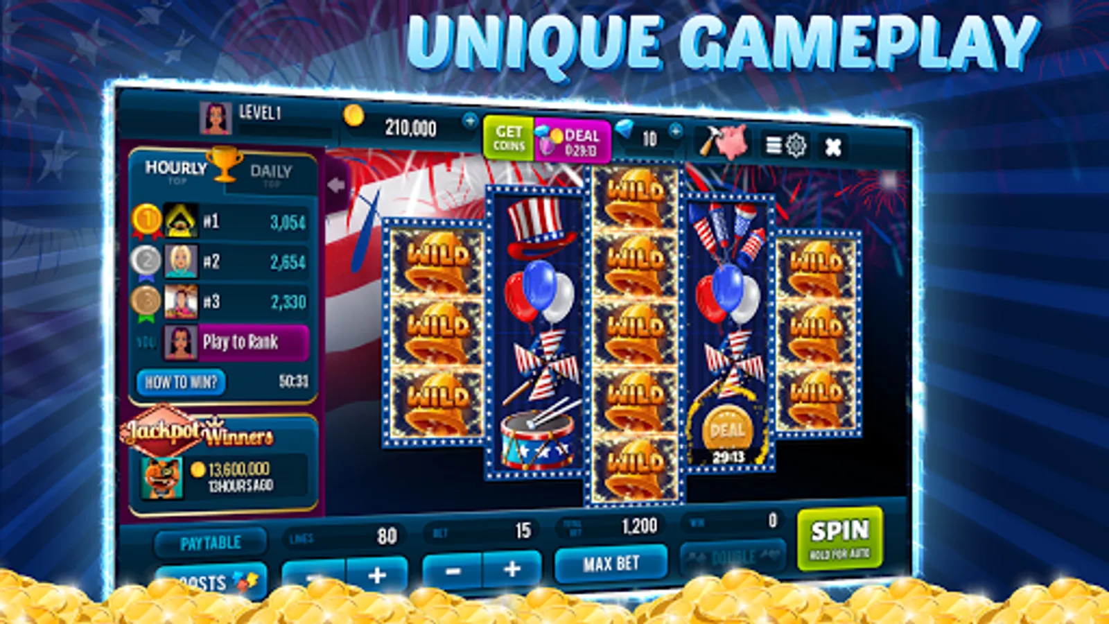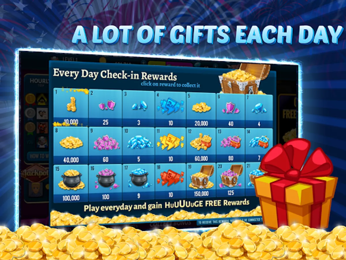 Now you can play amazing Independence Spin Slots any time and anywhere! Just connect your Facebook account and stay synced with coins, gems and your progress! Also you may invite friends and receive FREE COINS & GEMS Rewards!