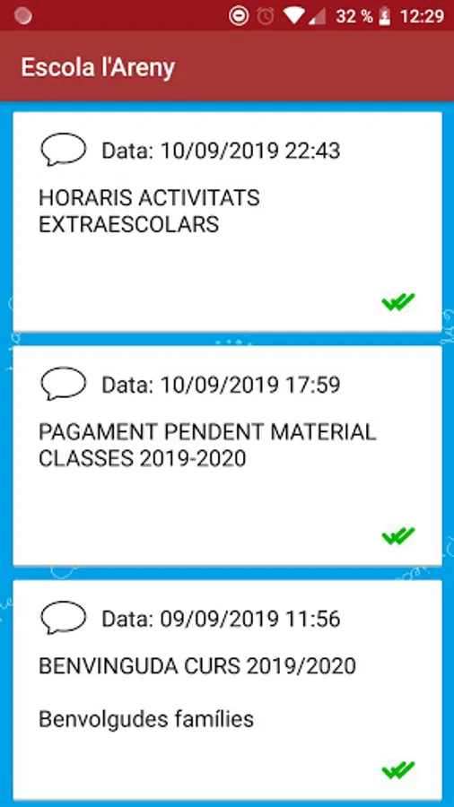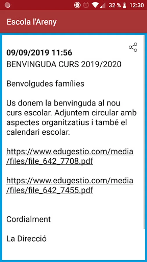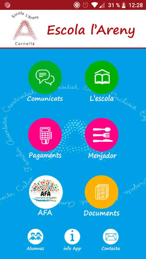 The application allows direct communication between the center and the parents of students. It consists of a first registration screen where the user is identified. Below is a menu with six options: section of announcements sent by the school -whether general or personalized announcements-, section "The school" with direct access to the center's website, section "Payments" to make payments of the school, section "Dining room" with all the information of the service, section "AFA" with information about the association, section "Documents" with documents of the school and section "Contact" with the contact details of the school .