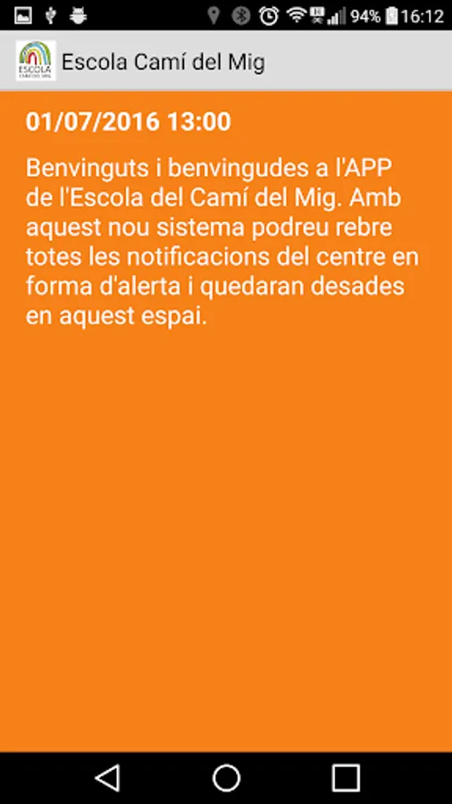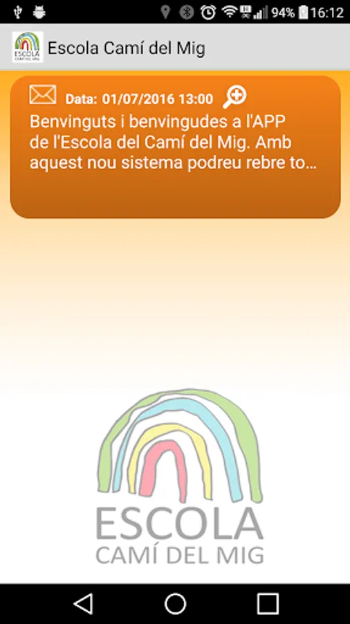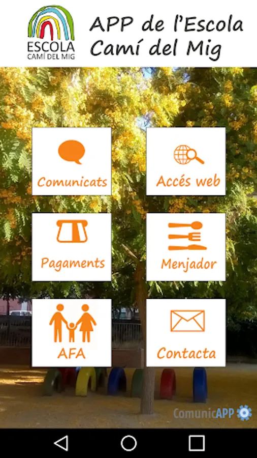 The application allows direct communication between the center and the parents of students. It consists of a first registration screen where the user is identified. Below is a menu with six options: section of announcements sent by the school -whether general or personalized announcements-, section "Web Access" with direct access to the center's website, section "Payments" to make the payments of the school, "Canteen" section with all service information, "AFA" section with association information and "Contact" section with school contact details.