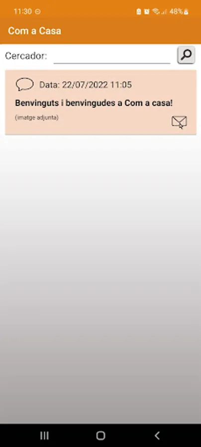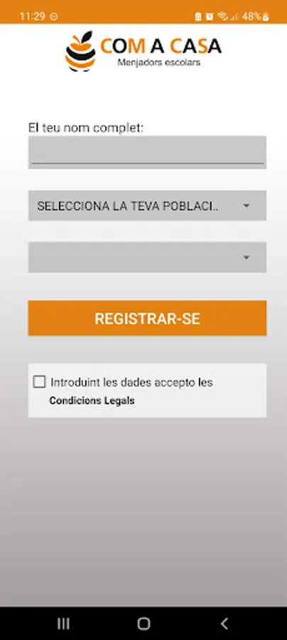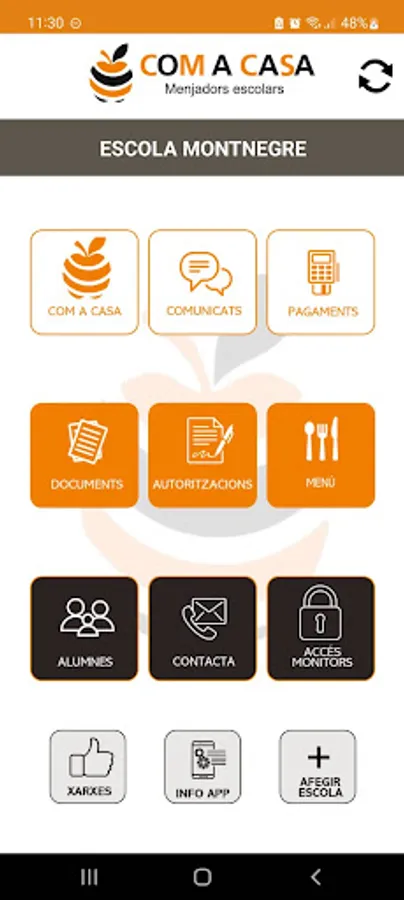 Coma Casa app, catering in educational centers and providers of extracurricular activities. The application allows direct communication between Coma Casa and users. The menu consists of several options: who we are, communications, payments, documents, authorizations, dining menu, students, contact and monitor access. In the bottom bar are the sections: networks, Info App and add school.