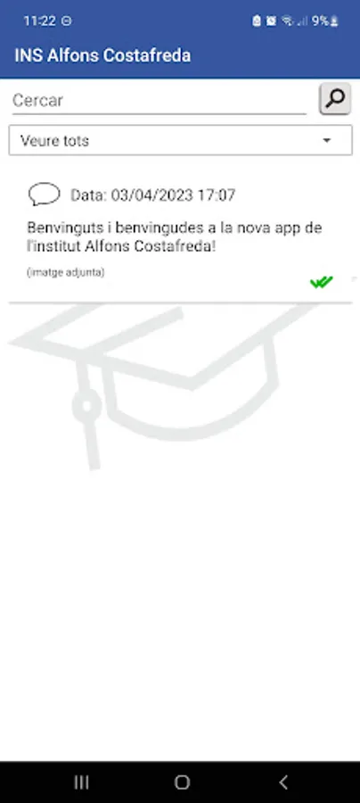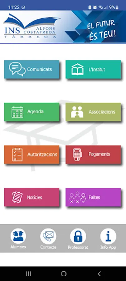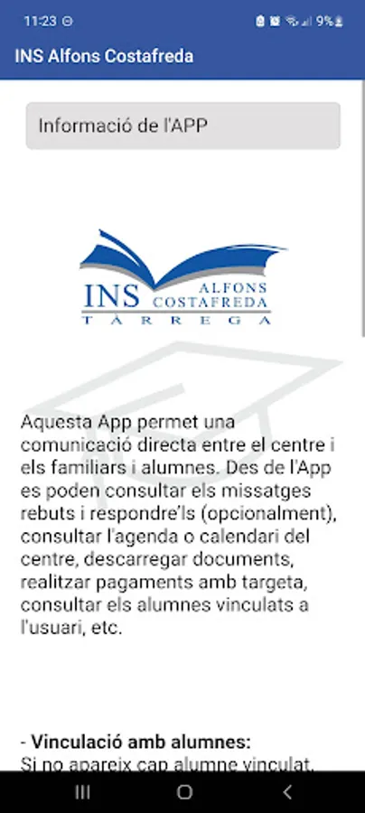 APP of the Alfons Costafreda Institute of Tarrega. The application allows direct communication between the center and the students' parents. It consists of a first registration screen where the user is identified. Next appears a menu with several options: section of communications sent by the Institute - either general or personalized communications -, the Institute, calendar of events, associations, documents and authorizations, section payments, news, absences. At the bottom are the sections: students, contact, teacher access, APP information.