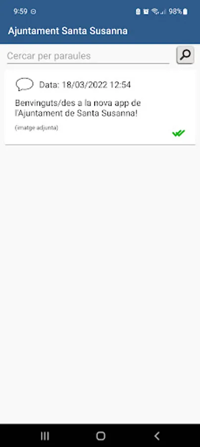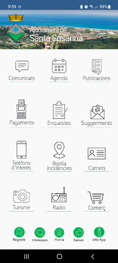 Santa Susanna City Council APP. It allows a direct communication between the City council and the inhabitants of the municipality. It consists of the following sections: announcements, agenda of events, municipal magazine publications, payments, citizen participation, contact form, telephone numbers of interest, mailbox of incidents, cards, tourist information, radio Santa Susanna, guide of commerce, telephone of emergencies, direct access to social networks: facebook and twitter. Finally, there is access to the registration section to access the restricted content and Interests to subscribe to the topics you want to receive in the press releases.