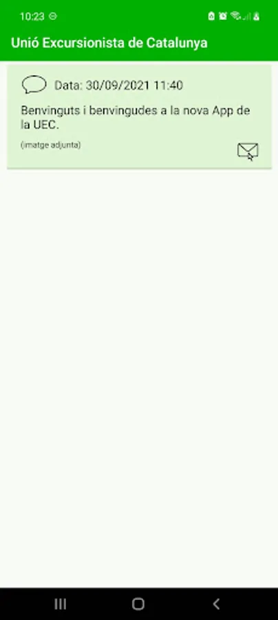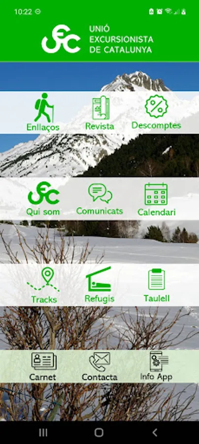 App of the Unió Excursionista de Catalunya (UEC). The application allows direct communication between the center and the partners. You must be a member of the UEC to be able to access the app. The menu consists of several options: Who we are, Press releases, Calendar, Links, Magazine, Discounts, Tracks, Shelters, Counter. In the bottom bar is the Card, Contact and Info Info section.