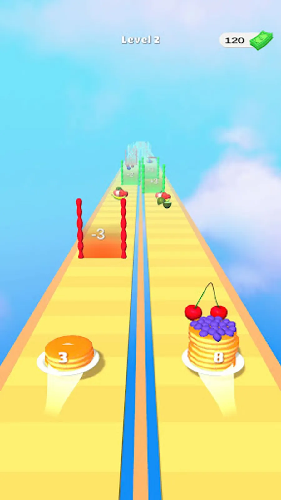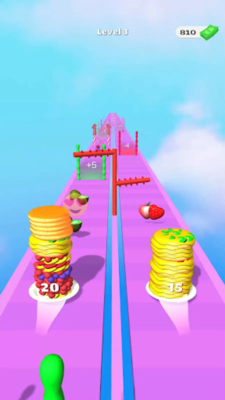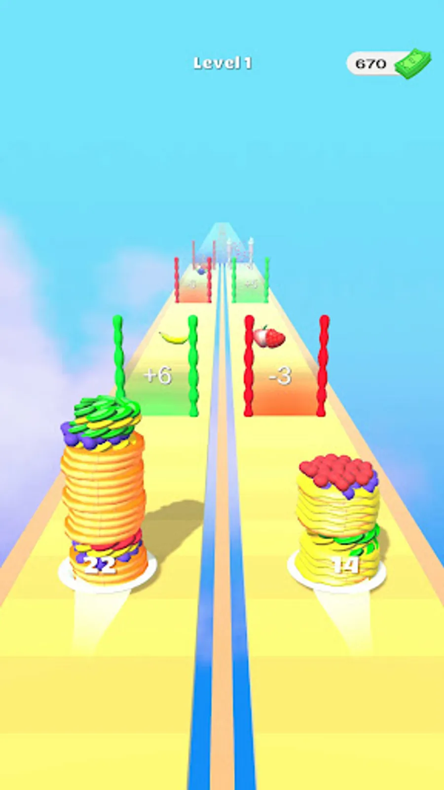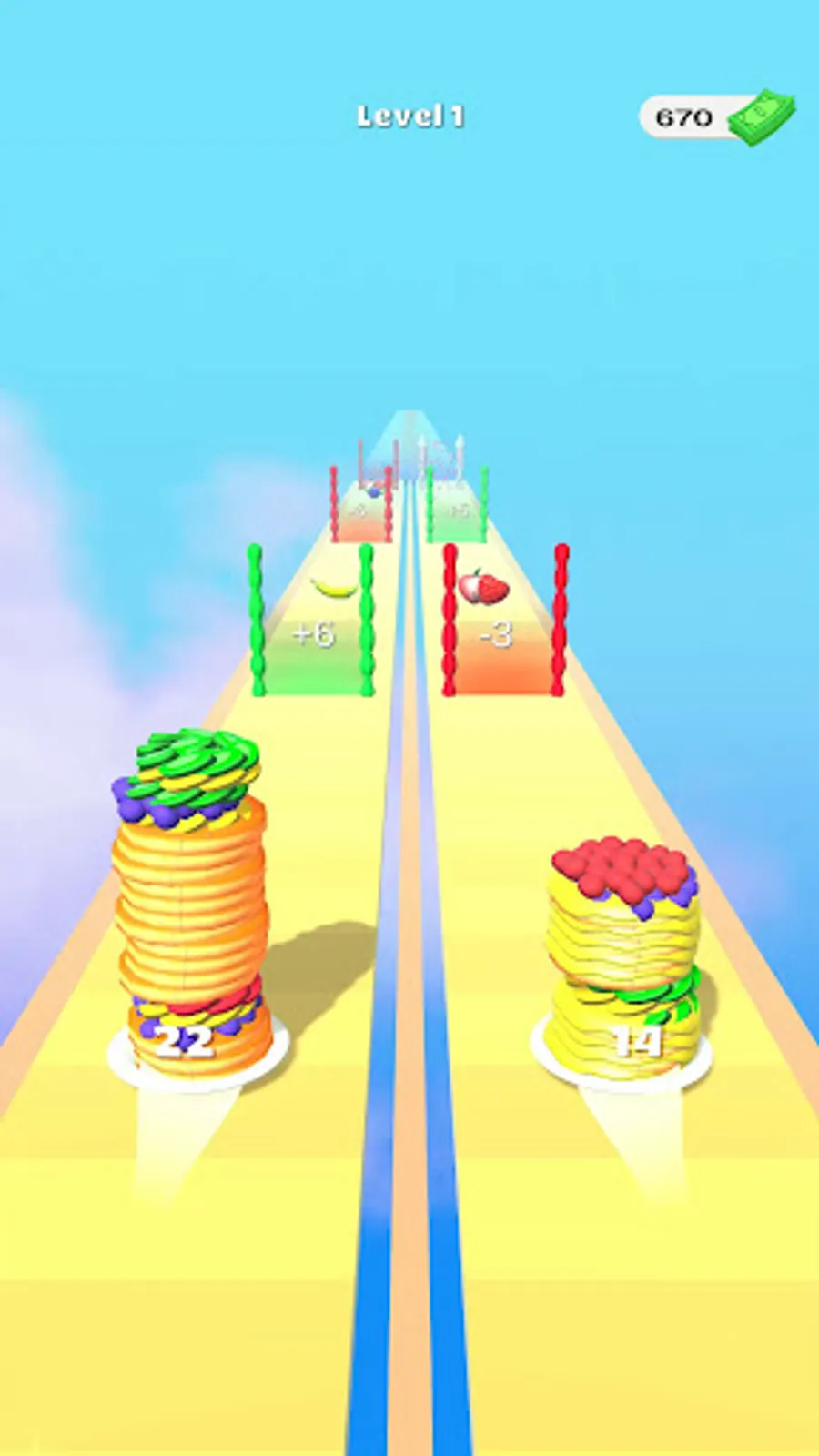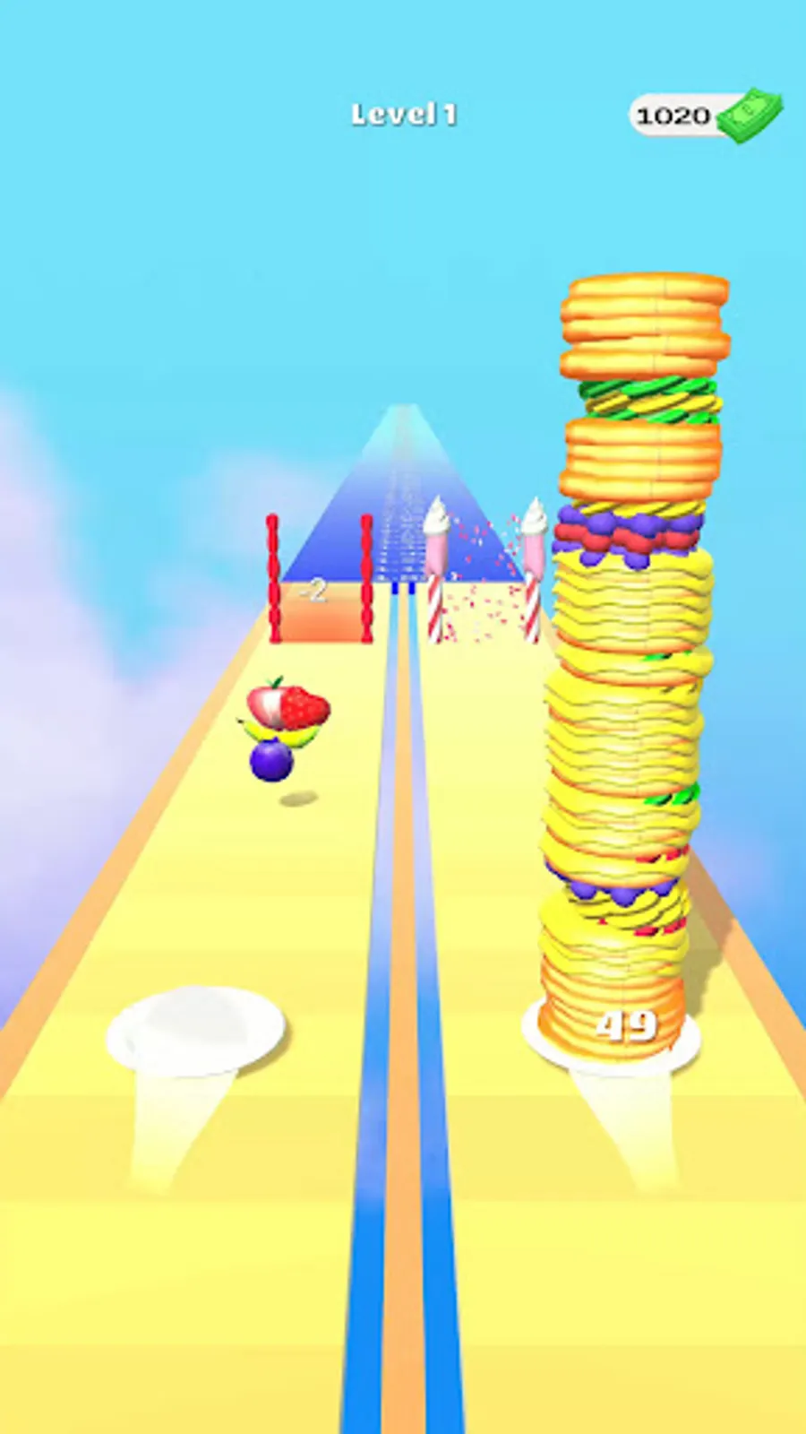 Delicious pancakes are waiting for you! The more you collect, the better. Equip your pancake stack with different toppings and fruits. Don't hit the obstacles or you'll lose the pancakes, hurry up! Make the best pancake stack.