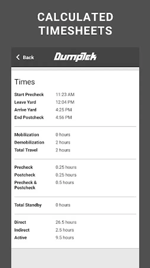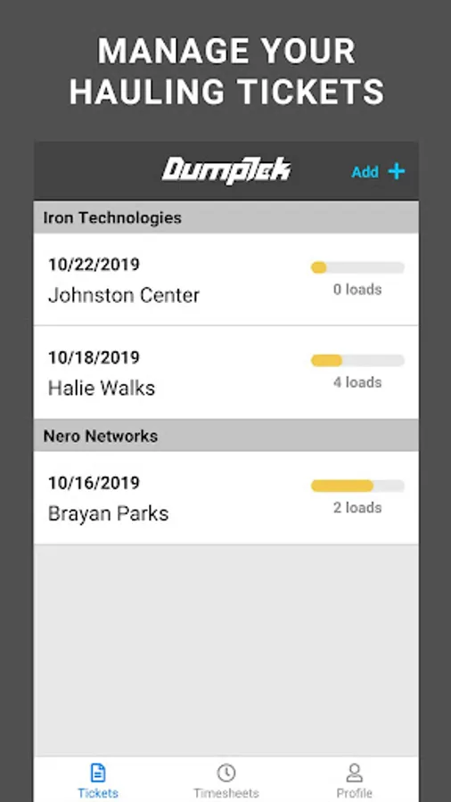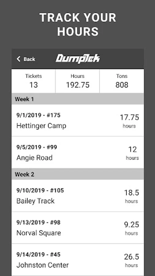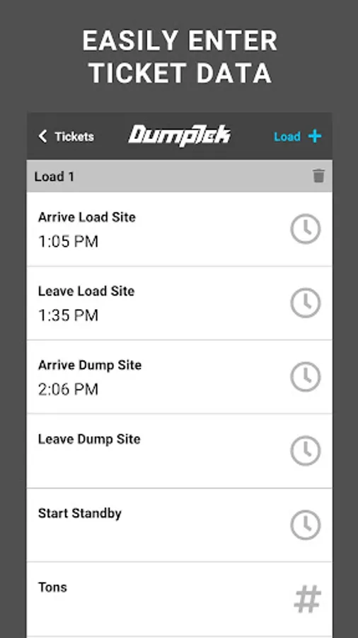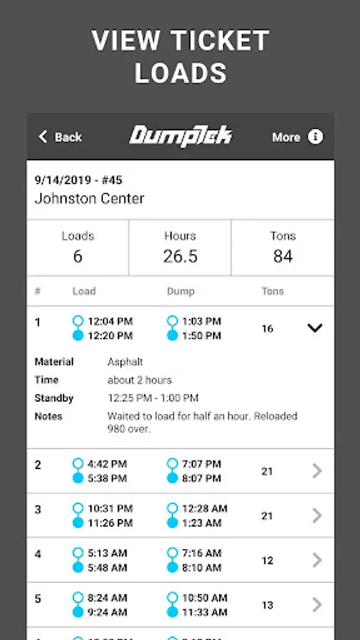 Digital Ticketing app for Construction Materials Transport Trucking Companies for an owner operator or a company with a massive fleet. DumpTek converts data from the field to your invoicing, payroll, and maintenance systems. The application is easy to use while mounted on the cab of the truck. You simply click a button for in and out at load sites and dump sites along with other simple interactions and DumpTek does the rest. The end results are PDF tickets that are familiar to the industry. Your customers will thank you and you will be the first on their list for the next job!