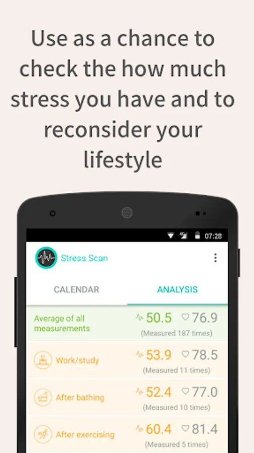 Just place a finger over the camera for two minutes, and StressScan will analyze changes in your heart rate interval and scientifically measure the level of your mental and physical stress on a scale of 1 to 100.