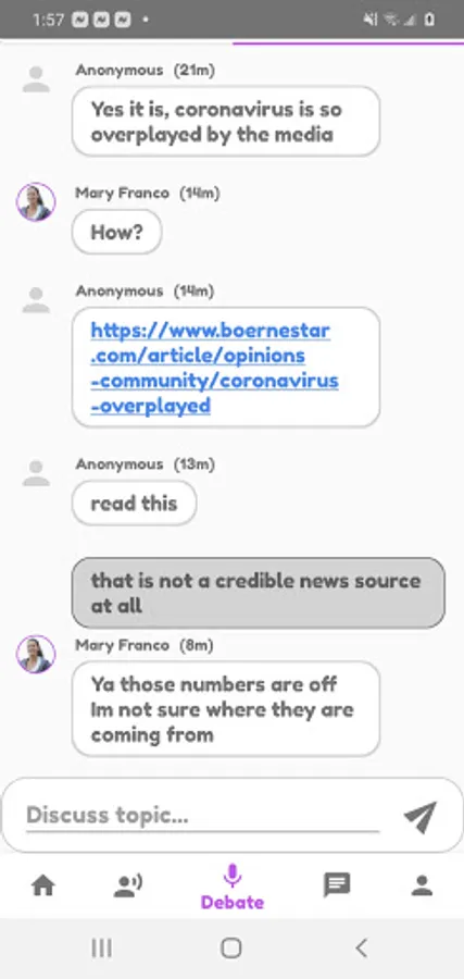 Debate - Talk about a certain topic on a live video connection with someone who disagrees with you. You may also join the global text chat for the topic and let your views be heard!