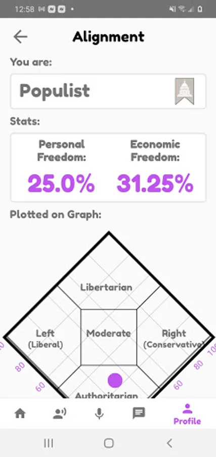 Alignment - Choose your party affiliation manually, or take a 16 question political quiz based on the popular Nolan Chart to see where your views align and compare to others! Get a detailed description of what you support.(American politics only)