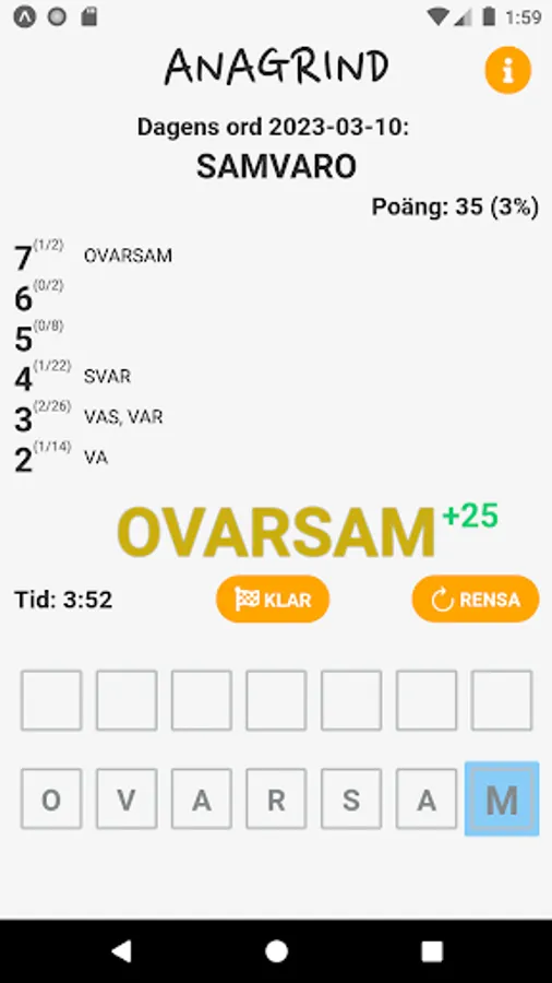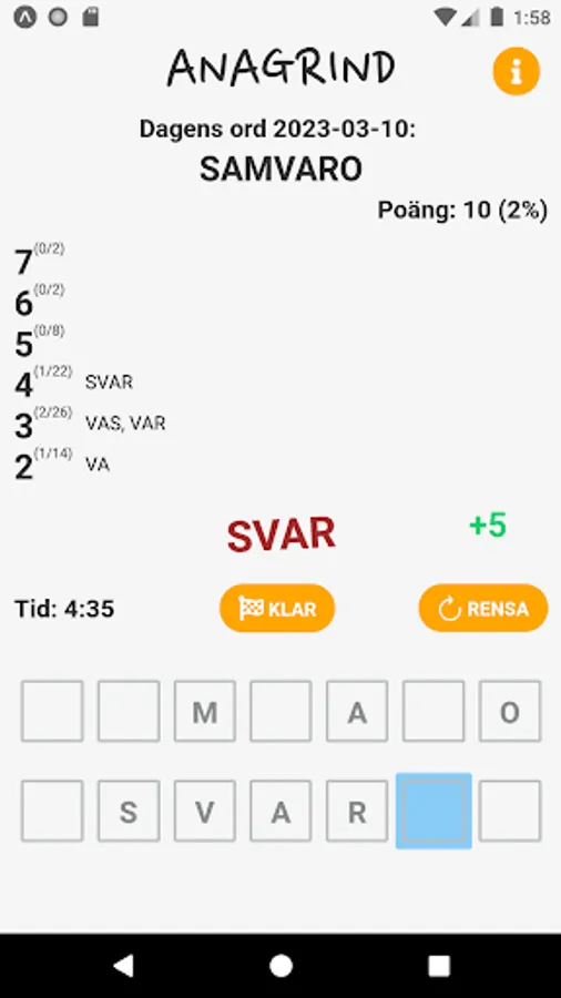 Anagrind is a word game where you have to find an anagram of seven letters, and all other words with fewer letters that are hiding. In the 'Wordle' spirit, a word is given a day. And it goes on time. Can be very addictive.