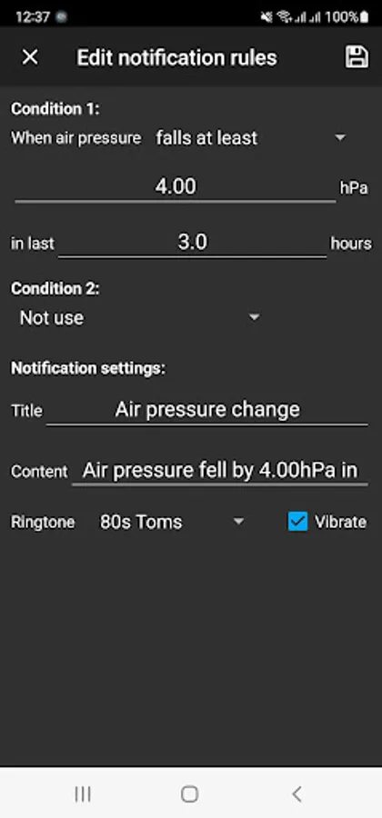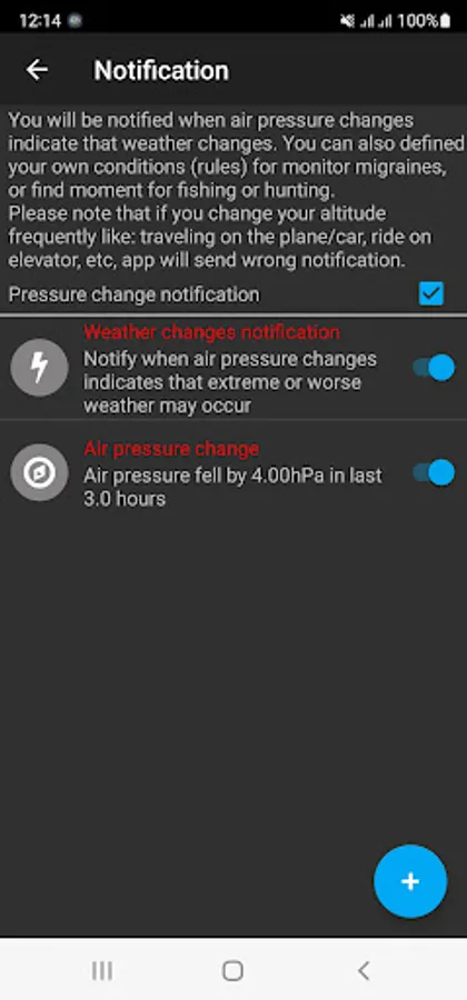 • Notification about pressure change. "Notification custom rule" for you to define how and when the app sends notifications.