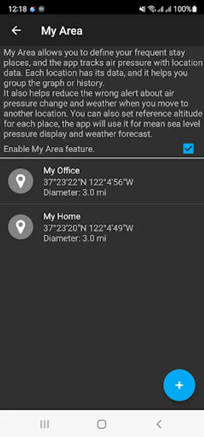 • "My Area" allows you to define your frequent stay places, and the app tracks air pressure with location data.