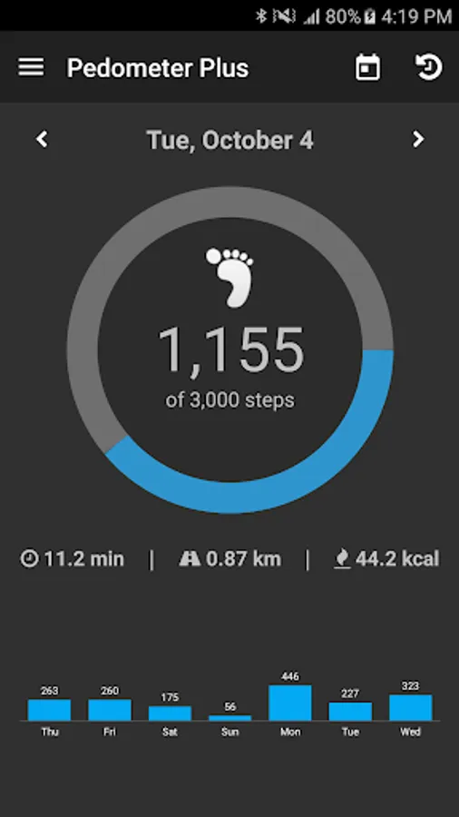 Pedometer Plus counts your steps, calculating your approximate distance, duration and calories burned every day.