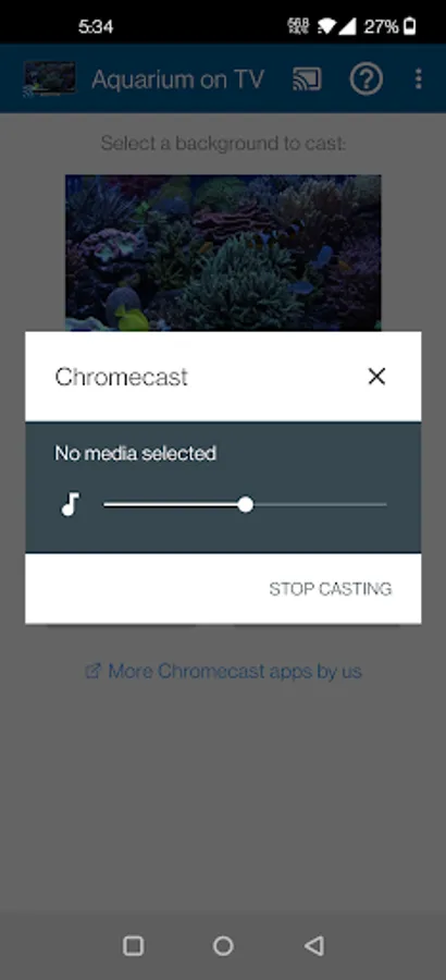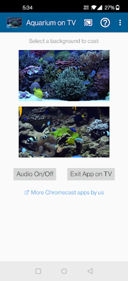 • The fish tanks also have realistic background audio - Tap the 'Audio On/Off' button to mute/unmute the aquarium sounds. You can use your TV's remote (or a Chromecast Remote) to change the audio volume.