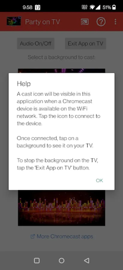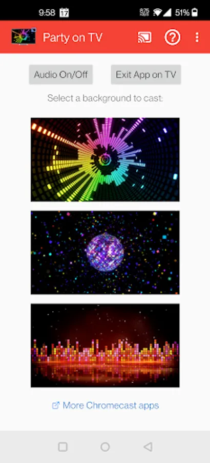 • No ads, no lags. Just fullscreen party backgrounds on the TV!