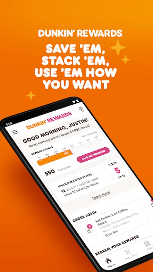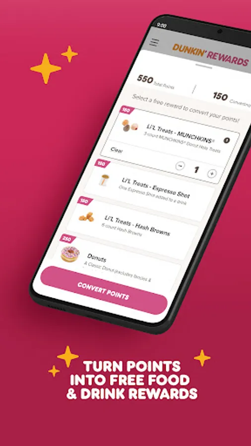 Runnin' has its rewards. Join our new rewards program, DUNKIN’ REWARDS, to earn your choice of free food and drinks, unlock Boosted Status to earn points faster and score members-only exclusive offers. Members earn 10 points per $1 spent on qualifying purchases in-store or when they order ahead.