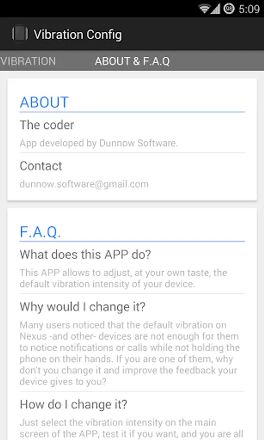 This app allows you to tune the vibration of your device at your own taste. As many of you have noticed, devices like Nexus 4 or Galaxy Nexus have a very quiet and discrete vibration, this app will allow you to turn it up a noch and personalize the feedback your device gives you.