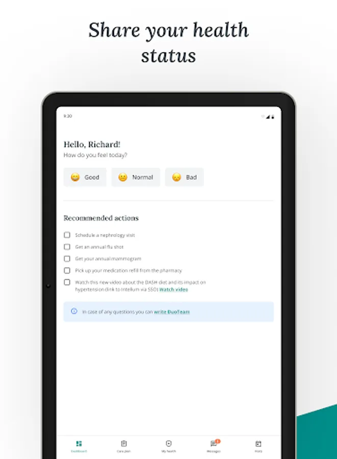 Duo Health is a new type of medical group for patients with CKD & ESKD and other chronic conditions. Our medical group and care teams are built to ensure better health outcomes so our patients enjoy a fuller life with their family and friends. The myDuoHealth app connects you to your dedicated clinical care team, simplifies the steps you can take toward your goals, lets you request and reschedule appointments, and gives access to all of your key records and information at your fingertips.