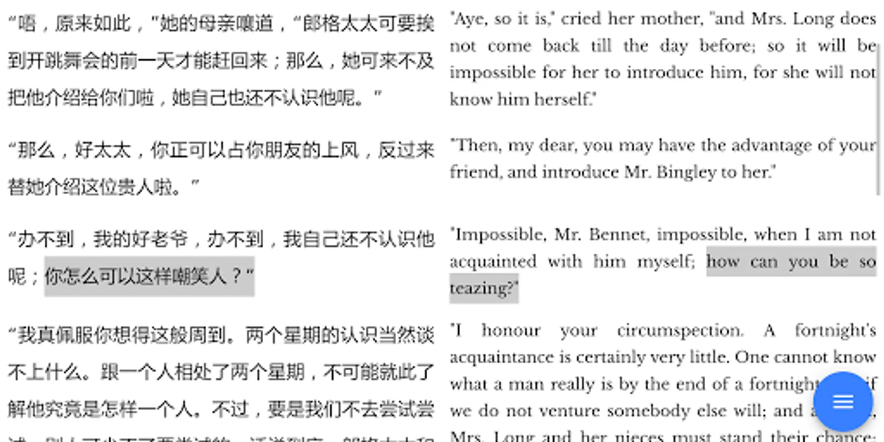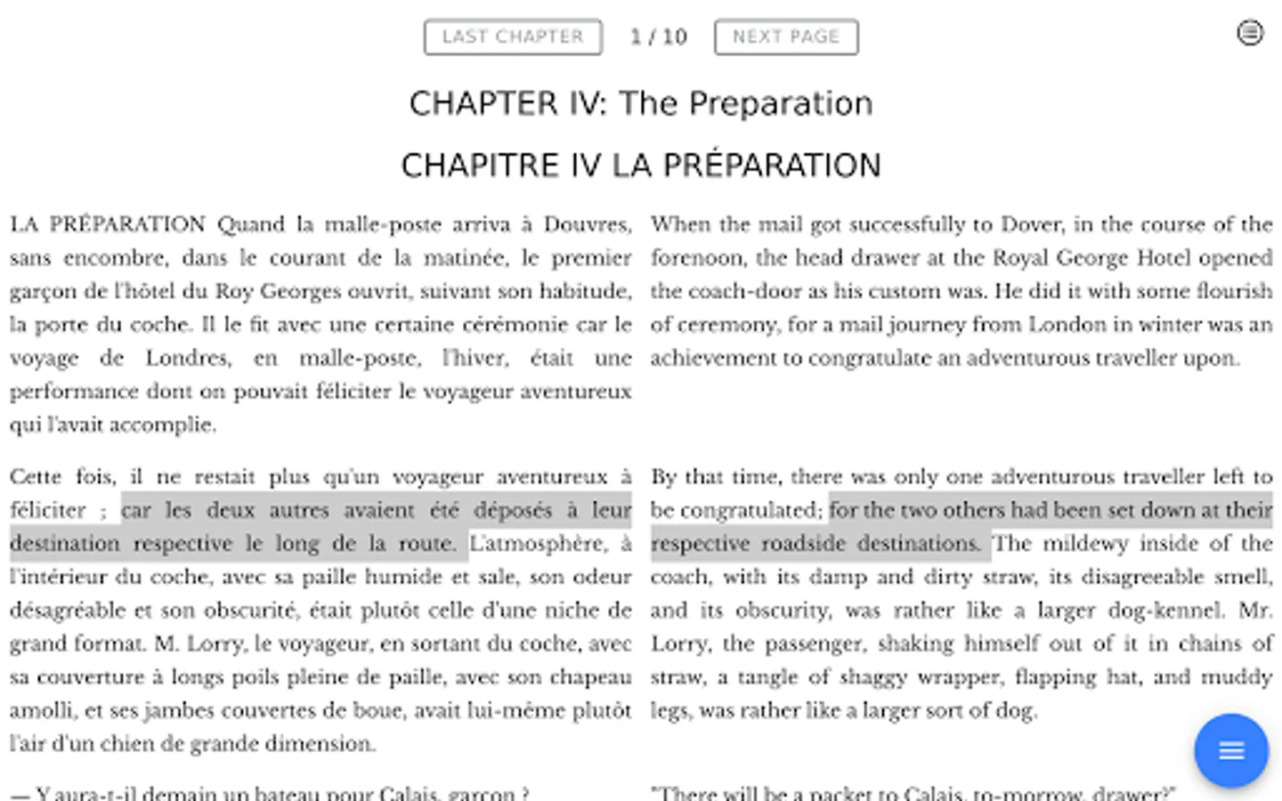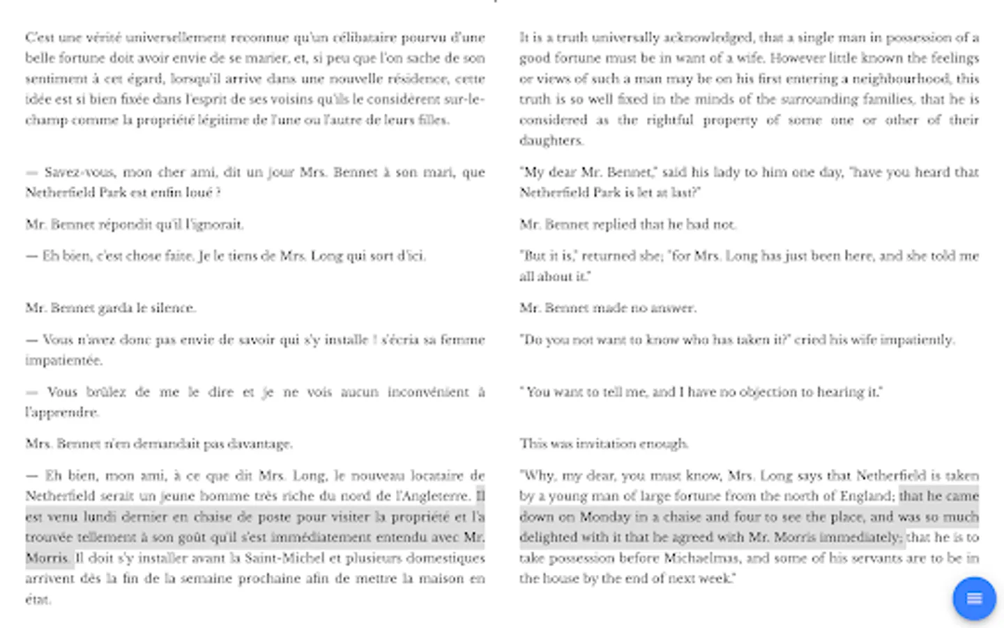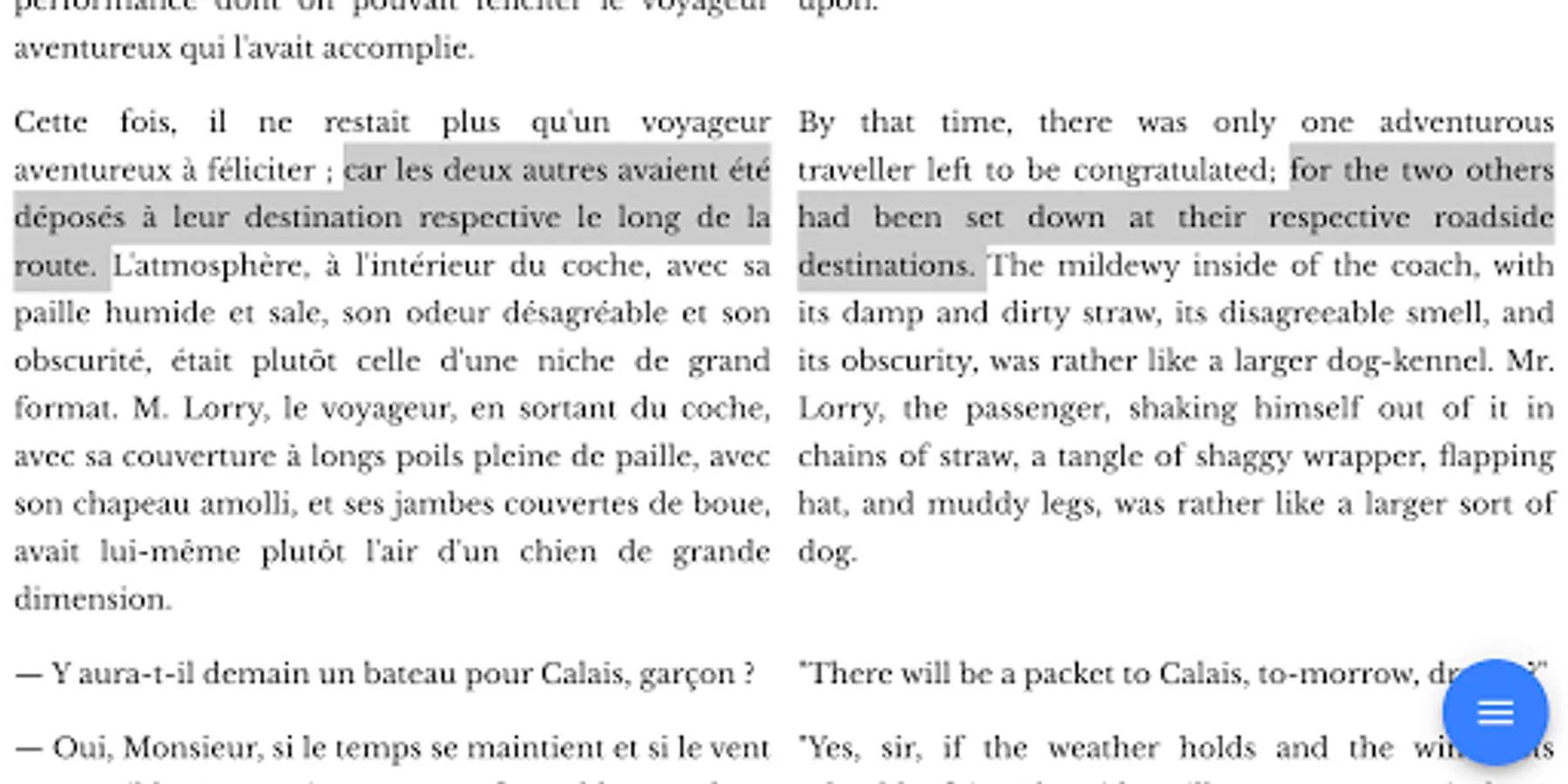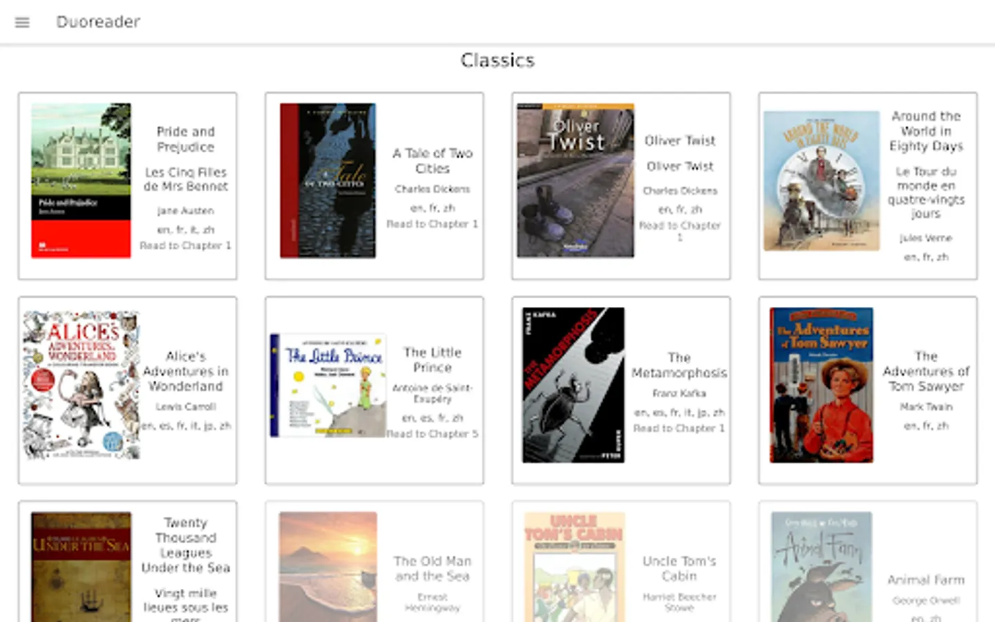 Duoreader makes it easy to read bilingual texts by matching the translations sentence-by-sentence. Quickly go between the texts in two languages as you advance your language mastery.